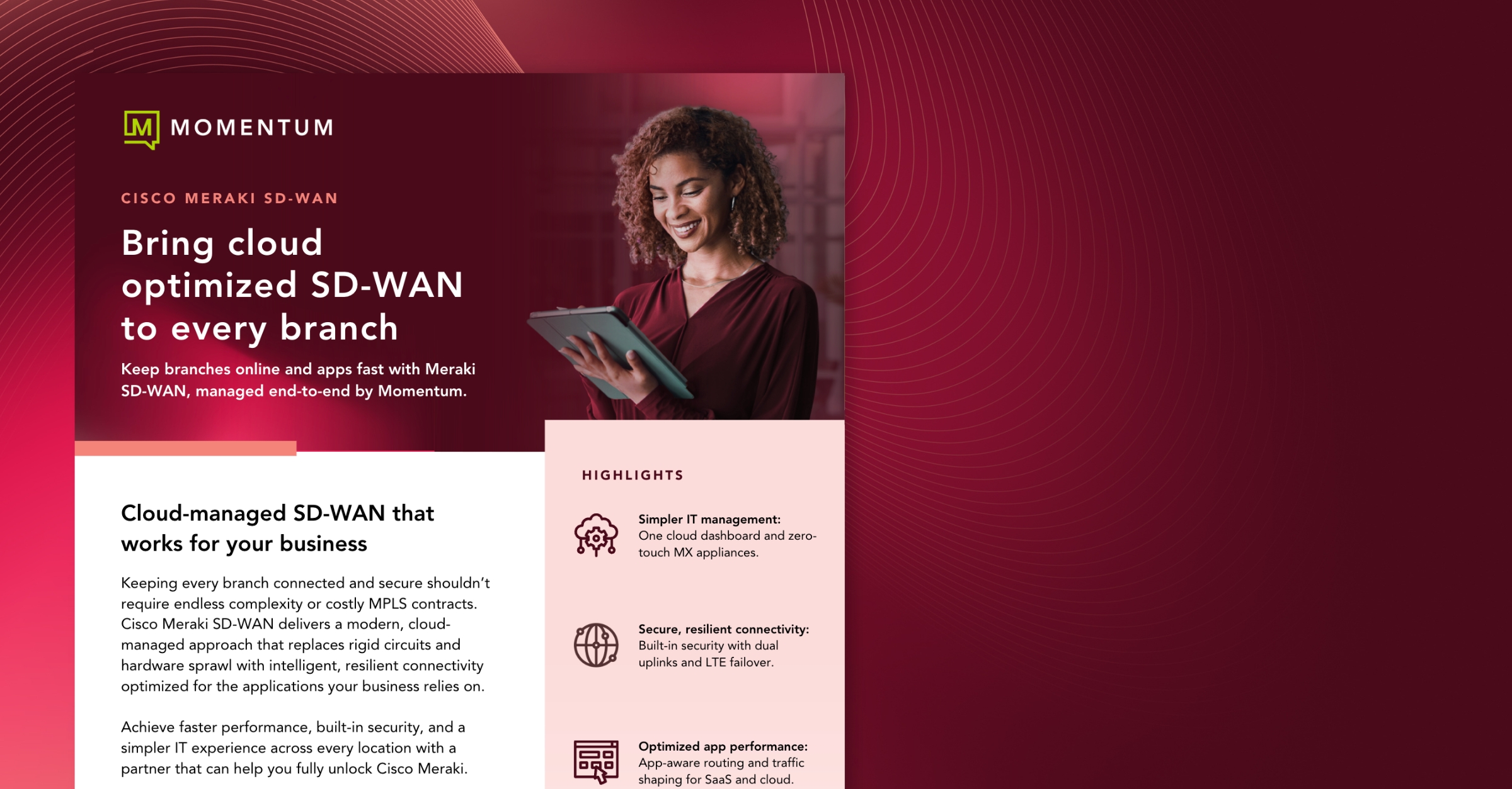 Download our datasheet to learn more about Cisco Meraki SD-WAN Keeping every branch connected should be simple. With Cisco Meraki SD-WAN managed by Momentum, you get secure, resilient connectivity and […]