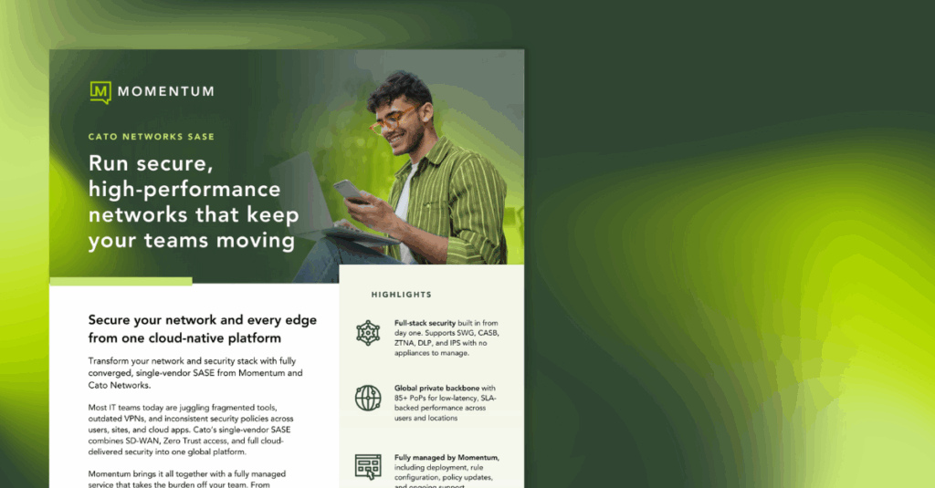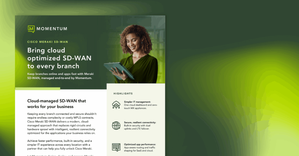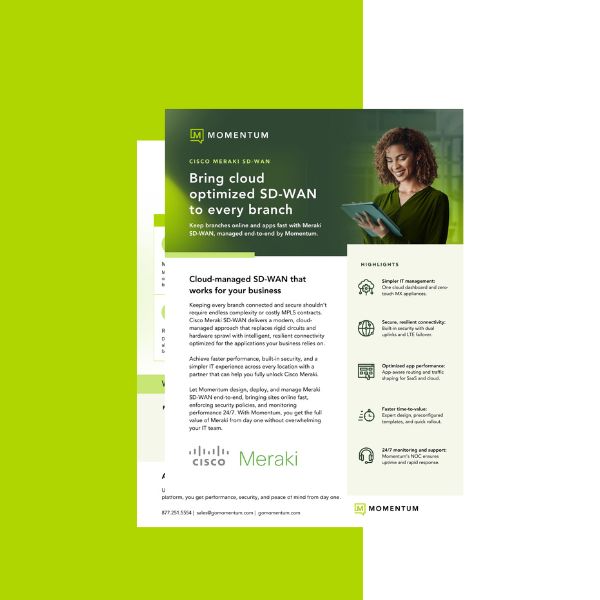 Keeping every branch connected should be simple. With Cisco Meraki SD-WAN managed by Momentum, you get secure, resilient connectivity and cloud-optimized performance without the burden of traditional WANs. From zero-touch deployment to 24/7 monitoring, Momentum helps you unlock the full value of Meraki from day one while giving your IT team peace of mind.