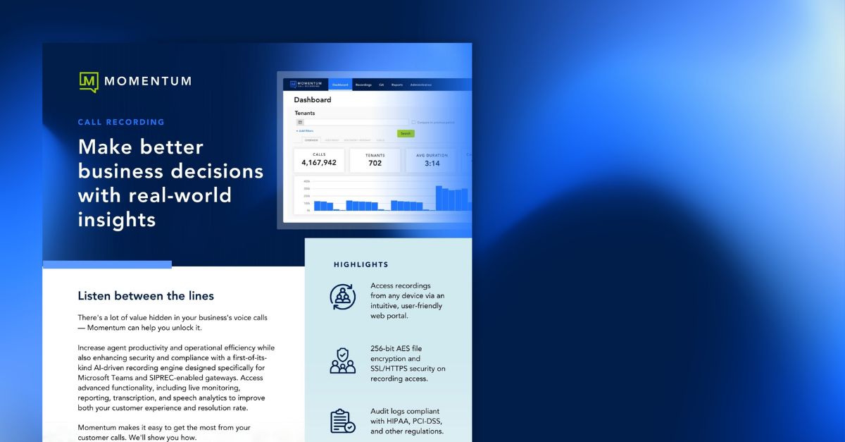 Teams Call Recording helps increase agent productivity and operational efficiency while also enhancing security and compliance with a first-of-its kind AI-driven recording engine designed specifically for Microsoft Teams and SIPREC-enabled gateways.